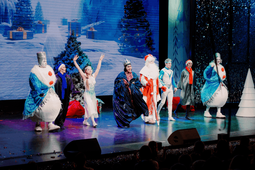С первых минут спектакль захватывал атмосферой праздника: новогодние декорации, сияющая ёлка, живая музыка и ощущение чуда, которое вот-вот произойдёт. Действие разворачивалось не только на сцене — герои появлялись и в зале, вовлекая зрителей в сюжет.